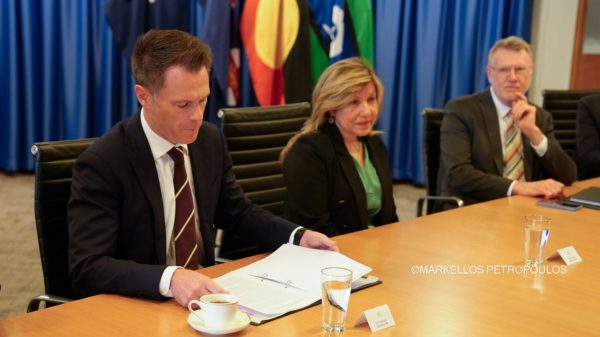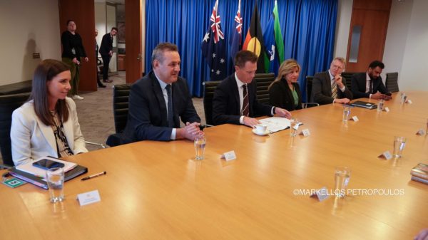 Τους υποδέχθηκε ο Πολιτειακός Πρωθυπουργός, κ. Chris Minns, ο οποίος τους οδήγησε στο Πρωθυπουργικό Γραφείο όπου είχαν εγκάρδια και γόνιμη συζήτηση, παρουσία των Υπουργών Μικρών Επιχειρήσεων, Περιουσίας και Πολυπολιτισμικότητος, κ. Steve Kamper, Οικονομικών, Βιομηχανίας, Κρατικών Προμηθειών και Φυσικών Πόρων, κ. CourtneyHoussos, και Εργασιακών Σχέσεων και Υγείας & Ασφάλειας στην Εργασία, κ. Σοφίας Κώτση.