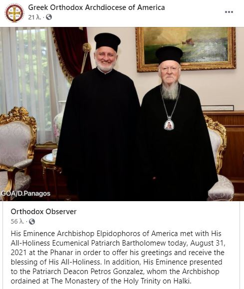 Ο Σεβασμιώτατος πήρε την ευλογία του Παναγιωτάτου, ενώ, μεταξύ άλλων, παρουσίασε στον Πατριάρχη τον Διάκονο Πέτρο Γκονζάλεζ, τον οποίο χειροτόνησε στη Μονή της Αγίας Τριάδος στη Χάλκη.