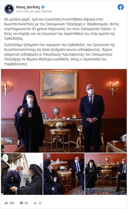 “Με μεγάλη χαρά, τιμή και συγκίνηση συναντήθηκα σήμερα στην Κωνσταντινούπολη με τον Οικουμενικό Πατριάρχη κ. Βαρθολομαίο. Φέτος συμπληρώνονται 30 χρόνια παρουσίας του στον Οικουμενικό Θρόνο. Ο Θεός να στηρίζει και να επευλογεί την προσπάθειά του στην ηγεσία της Ορθοδοξίας.