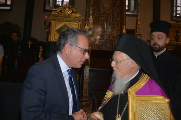 Ο Αρχιεπίσκοπος κ.κ. Ιερώνυμος, που συνοδευόταν από τους Μητροπολίτες Μεσογαίας και Λαυρεωτικής Νικόλαο και Γρεβενών Δαβίδ, τον Πρωτοσύγκελλό του, Επίσκοπο Θεσπιών Συμεών, τον Αρχιγραμματέα της Ιεράς Συνόδου της Εκκλησίας της Ελλάδος, Αρχιμ.Φιλόθεο Θεοχάρη, και τον Πρόεδρο της Αδελφότητος των Οφφικιάλων του Οικουμενικού Πατριαρχείου, “Παναγία Παμμακάριστος”, Άρχοντα Ορφανοτρόφο Γεράσιμο Φωκά, έγινε δεκτός με εγκαρδιότητα από τον Οικουμενικό Πατριάρχη Βαρθολομαίο.