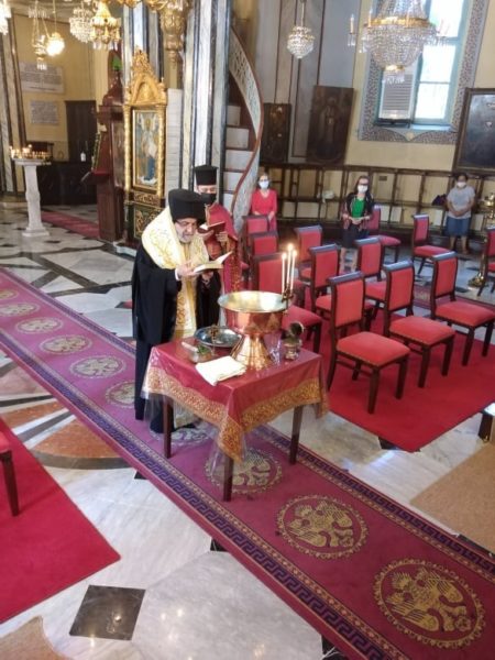 Μετά το πέρας της Θείας Λειτουργίας, ο Σεβασμιώτατος τέλεσε τον Αγιασμόν του μηνός Aυγούστου και Τρισάγιον υπέρ μακαρίας μνήμης και αιωνίου αναπαύσεως των ψυχών των κεκοιμημένων δούλων του Θεού αειμνήστων Μητροπολιτών Κινσάσας κυρού Νικηφόρου, συμφοιτητού του Μητροπολίτου, Λύστρων Καλλινίκου και Αργυρουπόλεως Καλλινίκου, ως και του αειμνήστου Χαραλάμπους Παπαχαραλάμπους, Καθηγητού του Ποιμενάρχου στο Ζωγράφειο Λύκειο.