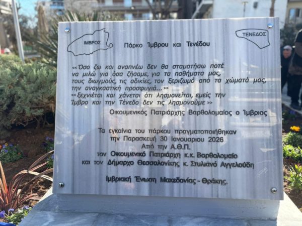 Παρουσία του Παναγιωτάτου Οικουμενικού Πατριάρχη κ.κ. Βαρθολομαίου, του Δημάρχου Θεσσαλονίκης Στέλιου Αγγελούδη και εκπροσώπων συλλόγων Ιμβρίων και Τενεδίων, εγκαινιάστηκε την Παρασκευή 30 Ιανουαρίου 2026, το πάρκο «Ίμβρου και Τενέδου» στη συμβολή των οδών Μητροπούλου και Γαμβέτα.