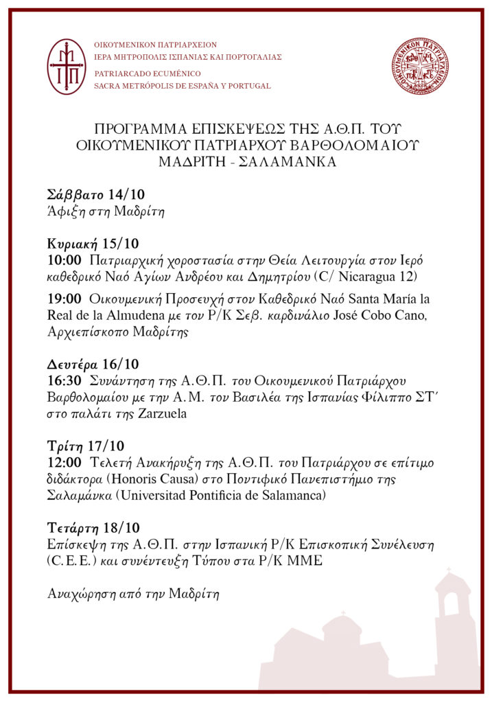Ο Παναγιώτατος Οικουμενικός Πατριάρχης κ.κ. Βαρθολομαίος επισκέπτεται επισήμως τη Μαδρίτη και τη Σαλαμάνκα από σήμερα, Σάββατο 14, έως την Τετάρτη 18 Οκτωβρίου 2023, με αφορμή την συμπλήρωση 20 ετών από την ίδρυση της Ιεράς Μητροπόλεως Ισπανίας και Πορτογαλίας (2003-2023) και 50 ετών από τα εγκαίνια του Ιερού Καθεδρικού Ναού των Αγίων Ανδρέου και Δημητρίου (1973-2023).