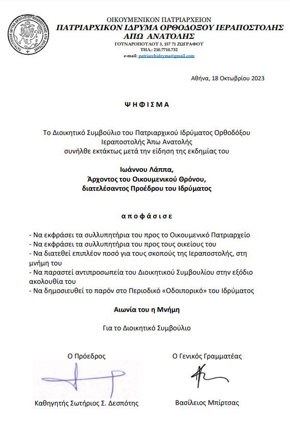Το Διοικητικό Συμβούλιο του Πατριαρχικού Ιδρύματος Ορθοδόξου Ιεραποστολής Άπω Ανατολής για την εκδημία του Ιωάννου Λάππα