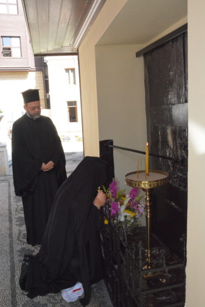 Νωρίτερα, ο Παναγιώτατος μετέβη, όπως κάθε χρόνο, στην Κλειστή Πύλη του Οικουμενικού Πατριαρχείου, τόπο του απαγχονισμού του Πατριάρχου Γρηγορίου Ε´, συνοδευόμενος από κληρικούς της Πατριαρχικής Αυλής, όπου άναψε κερί, κατέθεσε ανοιξιάτικα άνθη και προσευχήθηκε υπέρ της Εκκλησίας και του Γένους, επικαλούμενος τη χάρη και τις πρεσβείες του Αγίου Προκατόχου αυτού.