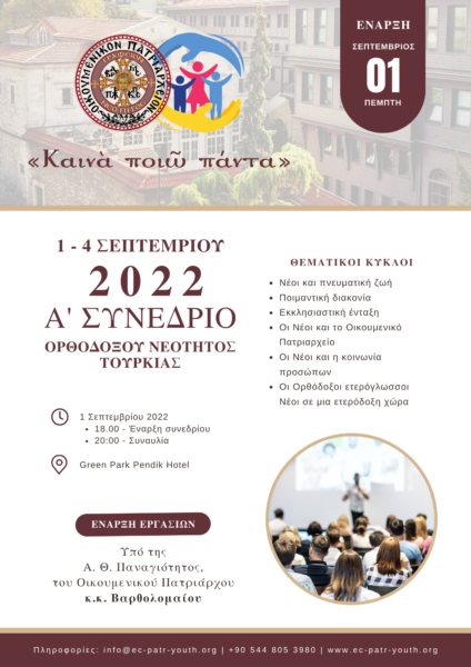 Το Συνέδριο θα διεξαχθεί στην Κωνσταντινούπολη από την 31η Αυγούστου μέχρι την 4η Σεπτεμβρίου 2022. Εν αυτώ θα συμμετέχουν όσον το δυνατόν περισσότεροι Ορθόδοξοι νέοι, που ζουν εν Τουρκία, διαφόρων εθνικοτήτων, ως ποίμνιον του Οικουμενικού Πατριαρχείου και των Μητροπόλεών του. Πρόεδρος της επιτροπής και του Συνεδρίου ωρίσθη υπό της Α. Θ. Παναγιότητος, ο Σεβ. Μητροπολίτης Ίμβρου και Τενέδου κ. Κύριλλος.