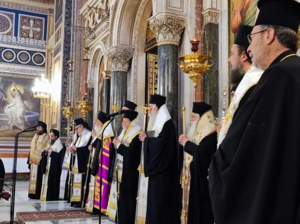Συγχοροστάτησαν οι Σεβασμιώτατοι Μητροπολίτες Ανέων κ. Μακάριος, Γουινέας κ. Γεώργιος, Δημητριάδος και Αλμυρού κ. Ιγνάτιος, Μεσαογαίας και Λαυρεωτικής κ. Νικόλαος, Μεσσηνίας κ. Χρυσόστομος, Αδριανουπόλεως κ. Αμφιλόχιος, Αργολίδος κ. Νεκτάριος, Περιστερίου κ. Γρηγόριος, Αιτωλίας και Ακαρνανίας κ. Δαμασκηνός, ο Επίσκοπος Δυτικής Αμερικής κ. Μάξιμος (Πατριαρχείο Σερβίας), ο Θεοφιλέστατος Επίσκοπος Ωρεών κ. Φιλόθεος, Αρχιγραμματέας της Ιεράς Συνόδου της Εκκλησίας της Ελλάδος.