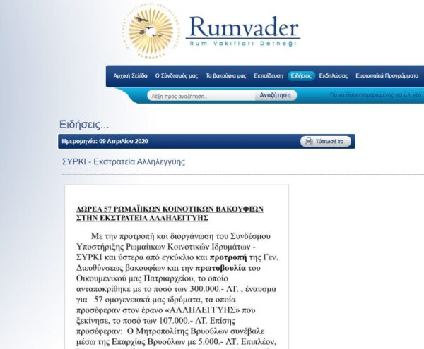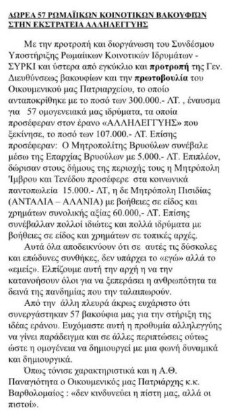 Μετά την προσφορά του Οικουμενικού Πατριαρχείου των 300.00 Τουρκικών Λιρών, έρχονται τα Ρωμαίϊκα Ιδρύματα (Βακούφια) να προσφέρουν και αυτά προς τον έρανο – εκστρατεία “ΑΛΛΗΛΕΓΓΥΗΣ” ως βοήθεια στις χαμηλού εισοδήματος οικογένειες εν μέσω κορονοϊού της γείτονος Τουρκίας, με το ποσό των 107.000 τουρκικών λιρών. Επίσης, η Μητρόπολη Βρυούλων συνέβαλε με το ποσό των 5.000 ΛΤ, όπως επίσης η Μητρόπολη Ίμβρου και Τενέδου προσέφερε στα κοινωνικά παντοπωλεία 15.000 ΛΤ και η Μητρόπολη Πισιδίας συνέβαλε με βοήθειες σε είδος και χρημάτων συνολικής αξίας 60.000 ΛΤ.