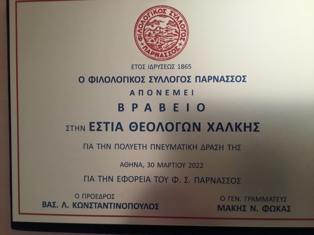 Βραβείο από τον Φιλολογικό Σύλλογο Παρνασσού, σε εκδήλωση που πραγματοποιήθηκε την Τετάρτη στην Κεντρική Αίθουσα του ιστορικού Συλλόγου, έλαβε για την προσφορά της η Εστία Θεολόγων Χάλκης.