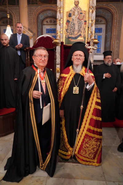 Τη χειροθεσία σε Άρχοντα Πρωτομαΐστορα του κ. Γεωργίου Πενέλη, Ομότιμου Καθηγητή της Πολυτεχνικής Σχολής του Α.Π.Θ. τέλεσε ο Οικουμενικός Πατριάρχης κ.κ. Βαρθολομαίος μετά την απόλυση της ακολουθίας του Μεγάλου Εσπερινού για την εορτή της Ινδίκτου, στην Ιερά Μονή Ζωοδόχου Πηγής Βαλουκλή.