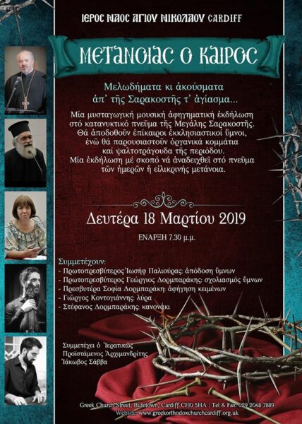Μία μυσταγωγική, πρωτότυπη καί πλήρως ἐναρμονισμένη στό κατανυκτικό πνεῦμα τῆς Μεγάλης Σαρακοστῆς, μουσική ἀφηγηματική ἐκδήλωση, πού θά πραγματοποιηθεῖ στόν Ἱερό Ναό του Αγίου Νικολάου στο Κάρντιφ, τη Δευτέρα 18 Μαρτίου, 2019.