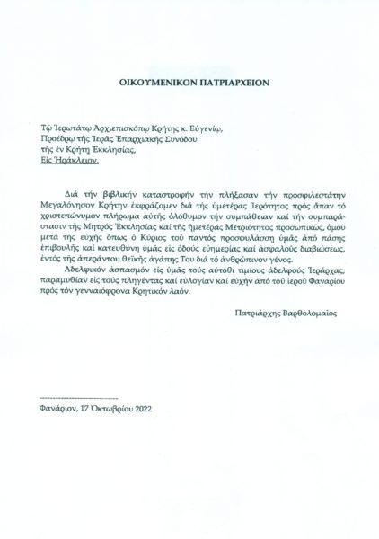 Για τα θλιβερά γεγονότα που συνέβησαν πρόσφατα στο νησί της Κρήτης, λόγω των ακραίων καιρικών φαινομένων με τις σφοδρές βροχοπτώσεις, ο Παναγιώτατος Οικουμενικός μας Πατριάρχης κ.κ. Βαρθολομαίος, απέστειλε Σεπτό Πατριαρχικό Γράμμα, προς τον Σεβασμιώτατο Αρχιεπίσκοπο Κρήτης κ. Ευγένιο, για να εκφράσει το Πατρικό και στοργικό ενδιαφέρον Του και την αμέριστη συμπαράστασή Του στους πληγέντες αδελφούς της Μεγαλονήσου και για να επιδαψιλεύσει την Πατριαρχική ευχή και ευλογία Του από το Ιερό Κέντρο της Ορθοδοξίας προς το δοκιμαζόμενο χριστεπώνυμο πλήρωμα της Μεγαλονήσου σημειώνοντας χαρακτηριστικά ότι πέμπει: