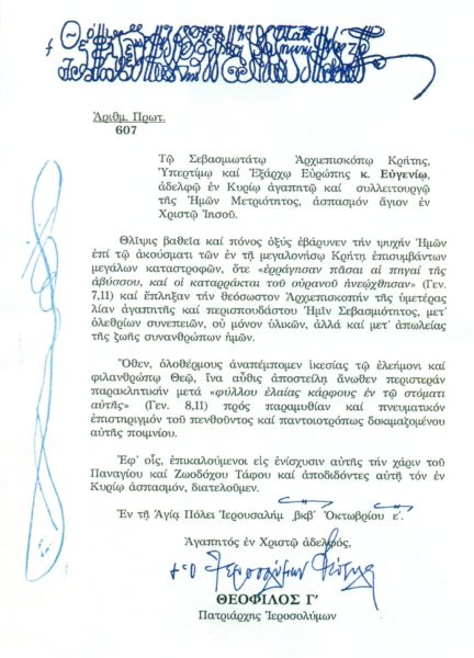 «…Ἀδελφικόν ἀσπασμόν εἰς ὑμᾶς τούς αὐτόθι τιμίους ἀδελφούς Ἱεράρχας, παραμυθίαν εἰς τούς πληγέντας καί εὐλογίαν καί εὐχήν ἀπό τοῦ Ἱεροῦ Φαναρίου πρός τόν γενναιόφρονα Κρητικόν λαόν».