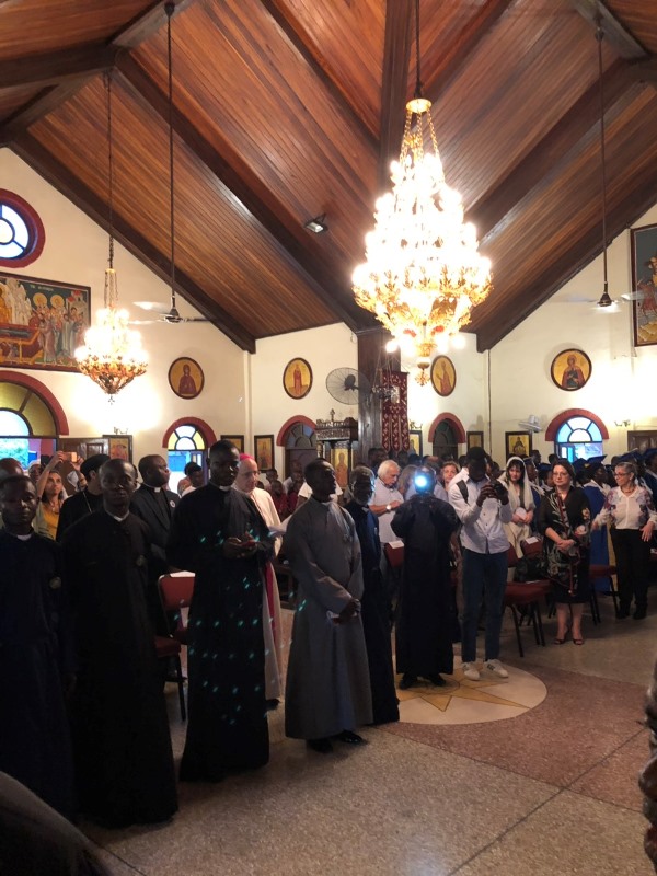 Στον προαύλειο χώρο του Καθεδρικού Ναού ο Μακαριώτατος έτυχε θερμής υποδοχής από το τοπικό ποίμνιο και ιδιαίτερα τα μικρά παιδιά, που τραγουδούσαν και χόρευαν σε τοπικούς ρυθμούς. Εντός του Ναού εψάλη η καθιερωμένη Δοξολογία και αντηλλάγησαν προσφωνήσεις. Ο Σεβασμιώτατος Μητροπολίτης Άκκρας κ. Νάρκισος καλωσόρισε θερμά τον Πατριάρχη και Διάδοχο του Αγίου Μάρκου, τονίζοντας την χαρά του ποιμνίου για την παρουσία του Πατριάρχη τους στην χώρα.