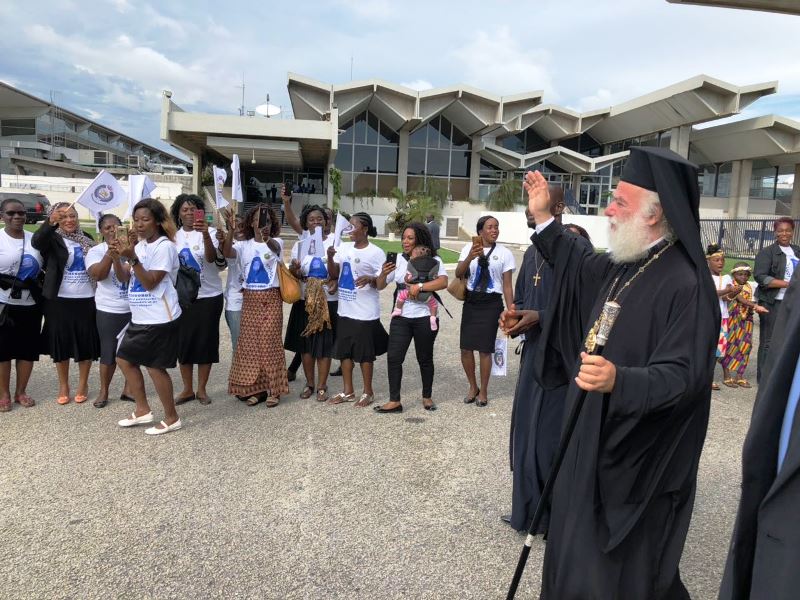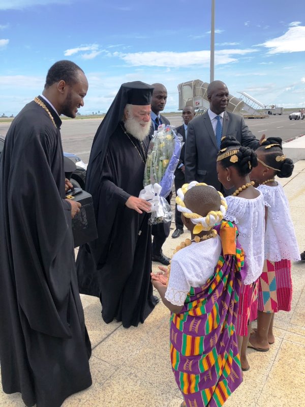 Στο αεροδρόμιο στον Μακαριώτατο επιφυλάχθηκε θερμή υποδοχή από τον Υπουργό Πολιτισμού της χώρας, τους Πρέσβεις της Αιγύπτου και του Λιβάνου, τον Γενικό Αρχιερατικό Επίτροπο της Ι. Μ. Γουινέας Πανοσιολ. Αρχιμ. Αθανάσιο Καγίεμπε, τον Αρχιερατικό Επίτροπο της Ακτής π. Ιερεμία, τον Πρόεδρο των Ορθοδόξων Κοινοτήτων δικηγόρο κ. Koyo Sylvere, Κληρικούς και Ορθόδοξους ιθαγενείς.