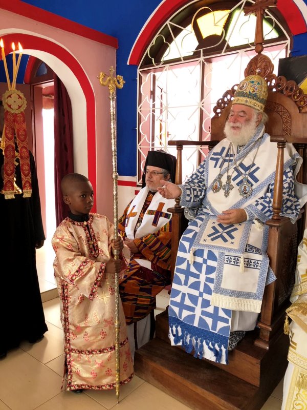 Ο Μακαριώτατος βαθιά συγκινημένος αναφέρθηκε στην 18χρονη παρουσία της Ορθοδοξίας στην χώρα και, μεταξύ άλλων, ευχαρίστησε τον Θεό που έφερε τα βήματά του για πρώτη φορά στην τόσο όμορφη χώρα της Ακτής. Στην συνέχεια ευχαρίστησε τον οικείο ποιμενάρχη Σεβασμ. Μητροπολίτη Άκκρας κ. Νάρκισο, που παρά τα πολλά του καθήκοντα στην Αλεξάνδρεια, αγωνίζεται για να μεγαλώσει η παρουσία της Ορθοδοξίας στην Ακτή, αναφέρθηκε δε στις δραστηριότητες του Πατριαρχείου στην χώρα και ιδιαίτερα το ενδιαφέρον του για τα μικρά παιδιά και την άρτια εκπαίδευσή τους. Ευχαρίστησε επίσης, τον π. Ιερεμία και τους συνεργάτες του, που εργάζονται νυχθημερόν προς δόξαν Κυρίου και του προσέφερε ως ευλογία επιστήθιο σταυρό. Αναφέρθηκε με ευγνωμοσύνη στην Αδελφότητα Ορθοδόξου Ιεραποστολής Θεσσαλονίκης, που φρόντισε να κτίσει τον πρώτο Ορθόδοξο Ναό στην χώρα, το παρακείμενο Πρεσβυτέριο, τους ξενώνες και τις αίθουσες των κατηχητικών σχολείων. Τέλος, παρασημοφόρησε το ζεύγος Σίλβεστρου και Φλώρας Κογιό, που πρόσφατα δώρισαν στην Ιερά Μητρόπολη Άκκρας οικόπεδο για την ανέγερση Ιερού Ναού, Σχολείου και Κλινικής.