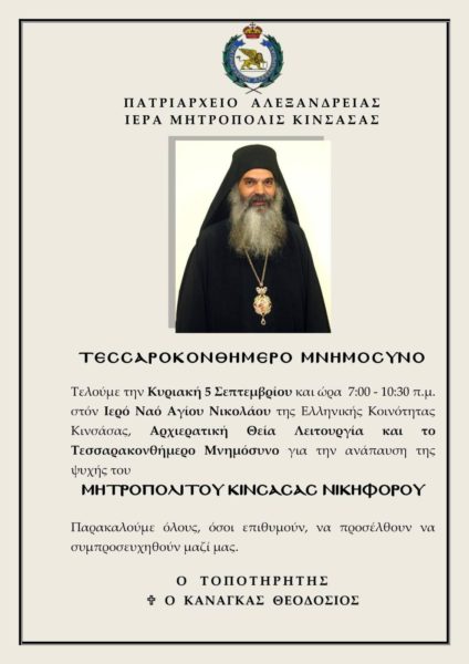 Το τεσσαρακονθήμερο μνημόσυνο του μακαριστού Μητροπολίτη κυρού Νικηφόρου θα τελεσθεί στην επαρχία όπου υπηρετούσε τα τελευταία χρόνια, στον Ιερό Ναό Αγίου Νικολάου της Ελληνικής Κοινότητας της Κινσάσας, την Κυριακή 5 Σεπτεμβρίου, με την Αρχιερατική Θεία Λειτουργία να ξεκινάει στις 7:00 π.μ.