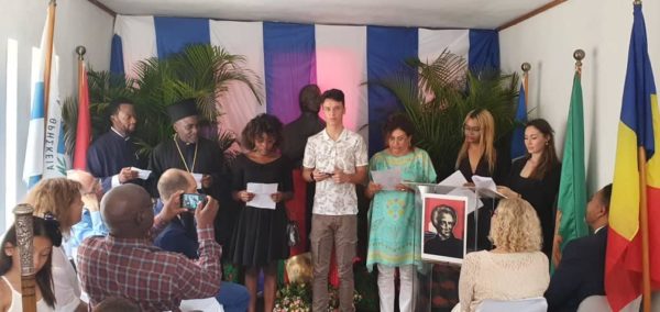 Μετά τους χαιρετισμούς, η νεολαία της παροικίας της Ιεράς Μητροπόλεως Ζάμπιας απήγγειλε τον Εθνικό Ύμνο σε διάφορες γλώσσες, ήτοι Ελληνικά, Αγγλικά, Γαλλικά, Γερμανικά, Ιταλικά, Ρωσικά και για πρώτη φορά έγινε απαγγελία και σε ντόπιες αφρικανικές τοπικές γλώσσες (Σουαχίλι, Μπέμπα και Νιάντζα).