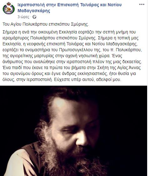 Σήμερα, η νεοφανής επισκοπή Τολιάρας και Νοτίου Μαδαγασκάρης, εορτάζει τα ονομαστήρια του Πρωτοσυγκέλλου της, του π. Πολυκάρπου και της αγιορείτικης μαρτυρίας στην αχανή νησιωτική χώρα. Ένας άνθρωπος που αναλώθηκε στην ιεραποστολή πλέον της μίας δεκαετίας. Ένα παιδί που έκανε τα πρώτα του βήματα στην Σκήτη της Αγίας Άννας του αγιωνύμου Όρους και έγινε άνδρας εκκλησιαστικός, ήτοι θυσία για όλους, στην Ιεραποστολή.
