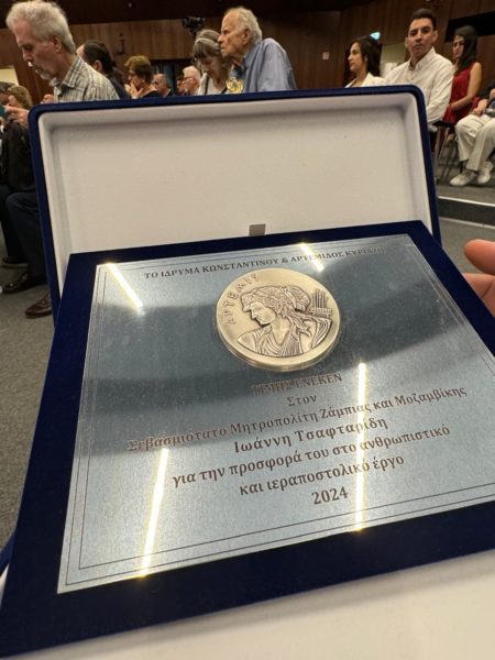 Με το Βραβείο Ευποιΐας τιμήθηκε, μεταξύ άλλων, ο Σεβασμιώτατος Μητροπολίτης Ζάμπιας κ. Ιωάννης σε εκδήλωση που πραγματοποιήθηκε την Τετάρτη 29 Μαΐου 2024, στο κατάμεστο αμφιθέατρο του Ινστιτούτο Γκαίτε στην Αθήνα, παρουσία βουλετών, τέως υπουργών, δικαστικών, προσωπικοτήτων των γραμμάτων και των τεχνών, και φίλων του Ιδρύματος Κυριαζή.