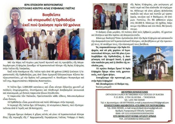 Αρχίζει με τη χάρη του Θεού και τις πρεσβείες της Μεγαλομάρτυρος Ευφημίας το έργο του Ιεραποστολικού Κέντρου της Αγίας Ευφημίας στη Γκέιτα Τανζανίας. Εκεί στην Κασάμουα της Γκέιτα πριν από 60 χρόνια ξεκίνησε η Ιεραποστολή της Ορθοδοξίας μας από έναν ομογενή Ελληνοκύπριο, τον Κώστα Χατζηκωνσταντίνου και με τη δράση του μακαριστού π. Θεοδώρου Νυαγκιάμα και του Αρχιεπισκόπου Αλβανίας κ. Αναστασίου.