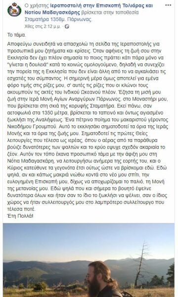 Αυτόν τον τόπο έκανα προσωπικό τάμα με την άφιξη μου στη Νότια Μαδαγασκάρη, να λειτουργήσω ανήμερα της εορτής του, και ο Κύριος κατεύθυνε τα γεγονότα έτσι ούτως ώστε να βρίσκομαι εδώ. Εδώ ψηλά, αν και κάπως μακριά νιώθω κοντά στο νέο μου σπίτι, την ευλογημένη Επισκοπή μου, δίχως να αποχωρίζομαι το παλιό, τη Μονή της μετανοίας μου.