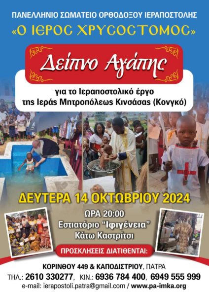 Το Πανελλήνιο Σωματείο Oρθοδόξου Ιεραποστολής “Ο Ιερός Χρυσόστομος” σάς προσκαλεί σε ΔΕΙΠΝΟ ΑΓΑΠΗΣ για την ενίσχυση του Ιεραποστολικού Έργου της Ιεράς Μητροπόλεως Κινσάσας και του Σεβασμιωτάτου Μητροπολίτου Κινσάσας κ. Θεοδόσιου, την Δευτέρα 14 Οκτωβρίου 2024 και ώρα 8.00 το βράδυ στο κέντρο ΙΦΙΓΈΝΕΙΑ στο Κ. Καστρίτσι.