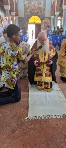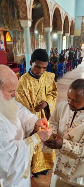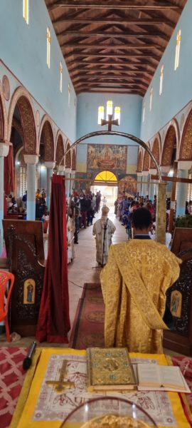 Ο Σεβασμιώτατος Μητροπολίτης Κινσάσας κ. Θεοδόσιος συνοδευόμενος από τους Αρχιμανδρίτες Χρυσόστομο (Ηγούμενο της Μονής Οσ. Αθανασίου του Αθωνίτου) και Ιωάννη, όπως και από τους Διακόνους Τιμόθεο και Ιερόθεο αλλά και λαϊκούς συνεργάτες κατέφθασε στο Μπαζαγκούγκου όπου τον υποδέχθηκε ο Εφημέριος του Ναού και Αρχιερατικός Επίτροπος Κονγκό Σαντράλ Πρωτοπρεσβ. Αγάπιος. Πλήθος πιστών κατέκλυσαν τον Ναό καθώς και οι μαθητές του Σχολείου της ενορίας «Άγιος Πολύκαρπος».