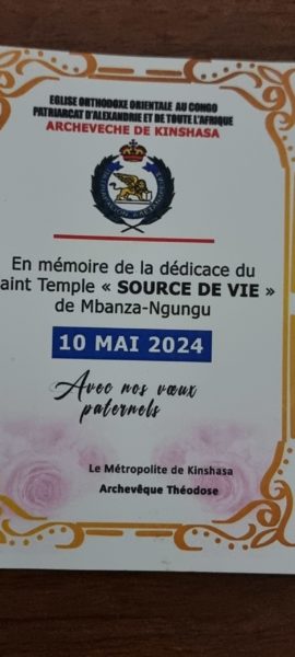 Ο Σεβασμιώτατος Μητροπολίτης Κινσάσας κ. Θεοδόσιος, με τις ευχές του Μακαριωτάτου Πάπα και Πατριάρχου Αλεξανδρείας και πάσης Αφρικής κ.κ. Θεοδώρου του Β’ τέλεσε την Παρασκευή 10 Μαΐου 2024, τα Εγκαίνια του Ιερού Ναού Ζωοδόχου Πηγής της μεγάλης πόλεως Μπαζαγκούγκου.