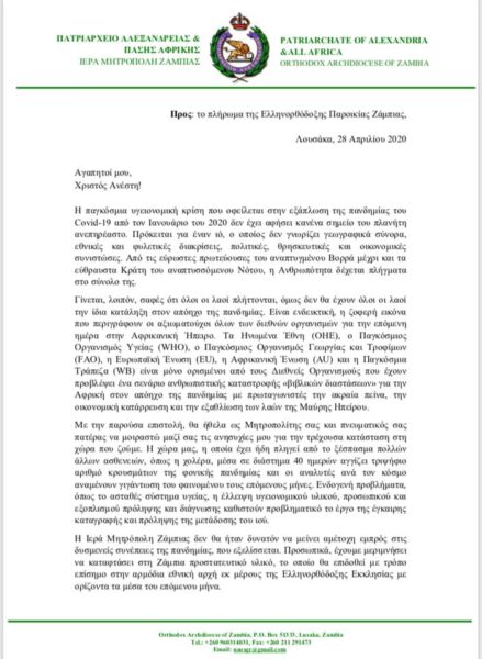 Η Ιερά Μητρόπολη Ζαμπιας στηρίζοντας την προσπάθεια για την μη εξάπλωση του κορωνοϊού, συνδράμει στον Εθνικό Οργανισμό Δημόσιας Υγείας της Ζάμπιας με υγειονομικό υλικό.