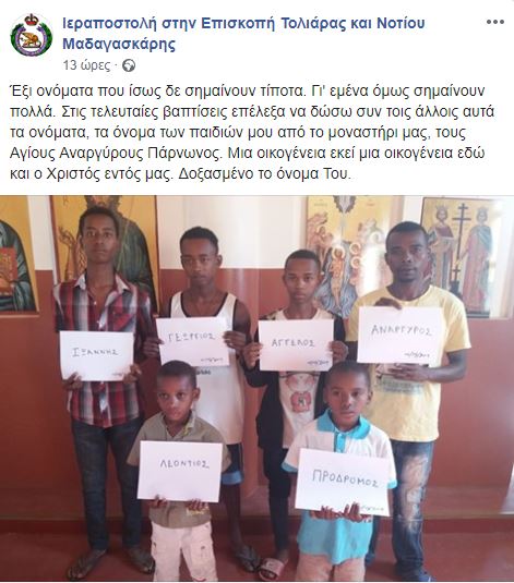 Μαζικές βαπτίσεις κατηχουμένων πραγματοποιήθηκαν τις προηγούμενες ημέρες στην Επισκοπή Τολιάρας και Νοτίου Μαδαγασκάρης. Ο αριθμός των νεοφώτιστων που έλαβαν το Άγιο Βάπτισμα τις προηγούμενες ημέρες ξεπέρασε τα 1οο άτομα. Ο Θεοφιλέστατος Επίσκοπος Τολιάρας και Νοτίου Μαδαγασκάρης με ανάρτηση του στο μέσο κοινωνικής δικτύωσης της Επισκοπής στο facebook εξήγησε την συμβολική σημασία έξι ονομάτων που έδωσε στους νεοφώτιστους. Αναφέρει χαρακτηριστικά: “Έξι ονόματα που ίσως δε σημαίνουν τίποτα. Γι’ εμένα όμως σημαίνουν πολλά. Στις τελευταίες βαπτίσεις επέλεξα να δώσω συν τοις άλλοις αυτά τα ονόματα, τα όνομα των παιδιών μου από το μοναστήρι μας, τους Αγίους Αναργύρους Πάρνωνος. Μια οικογένεια εκεί μια οικογένεια εδώ και ο Χριστός εντός μας. Δοξασμένο το όνομα Του”.