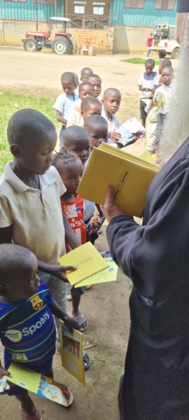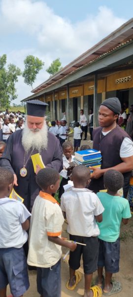 Ο Μητροπολίτης αφού μίλησε με αγάπη στα παιδιά για την μεγάλη εορτή της Αναστάσεως, μαζί με τους συνεργάτες του μοναχούς και την ιεραπόστολο κυρία Στέλλα Παπαδοπούλου μοίρασαν αναστάσιμες κάρτες, τετράδια, μολύβια, στυλούς, μπάλες και μπισκότα, προσφορά του Προέδρου της Ελληνικής Κοινότητας Κινσάσας κ Γερασίμου Ντούνη.