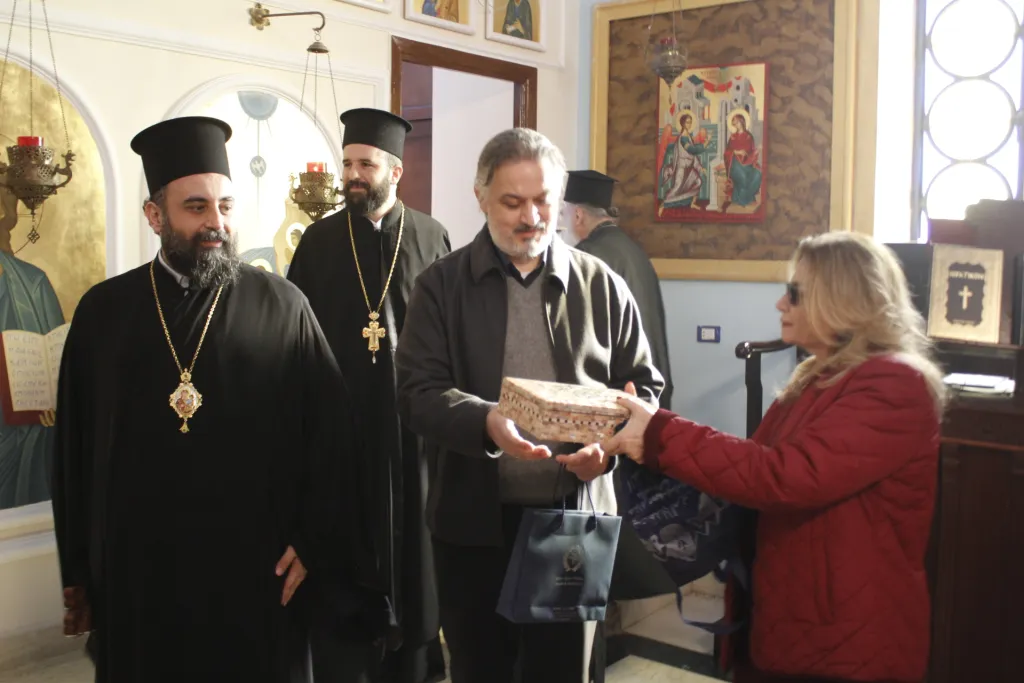 Μετά τον Μακαριώτατο, ο οποίος προσέφερε δώρο στον κ. Γενικό Πρόξενο και τους νοσηλευτές του Νοσοκομείου, η Πρόεδρος του ΕΝΟΑ κα Λιλίκα Θλιβίτου, τίμησε και αυτή με αναμνηστικό δώρο τον εορτάζοντα κ. Ιωάννη Πυργάκη εκ μέρους του Ναυτικού Ομίλου, ενώ παράλληλα παρέδωσε κατ’ εντολή του κ. Ιωάννη Σιόκα, την εικόνα που φιλοτεχνήθηκε από τη σύζυγο του αείμνηστου Γιώργου Κυπραίου, σύμφωνα με την τελευταία του επιθυμία.