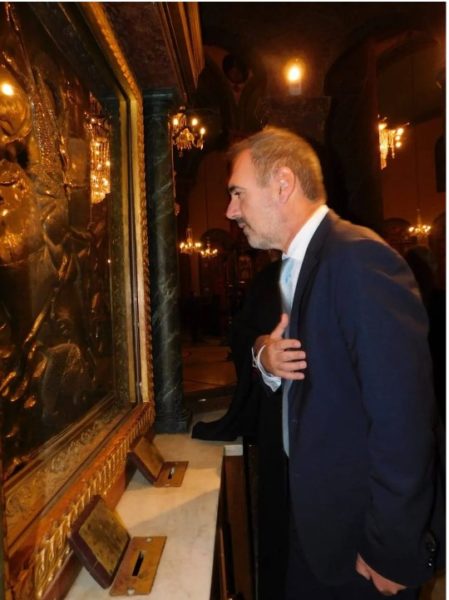 Τέλος δέχτηκε με ευλάβεια ως αναμνηστικό δώρο της επίσκεψής του από τον Πανοσιολογιώτατο Καθηγούμενο, την εικόνα του Αγίου Γεωργίου, πιστό αντίγραφο ενός πολύτιμου ψηφιδωτού που βρίσκεται στην Ιερά Μονή.