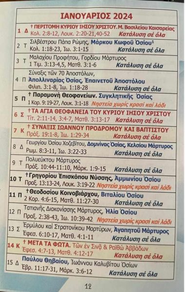 Στο Εορτολόγιο αναφέρονται με μπλε χρώμα οι Άγιοι της Αφρικής. Ταυτόχρονα παρατίθενται οι παραπομπές των Αγιογραφικών Αναγνωσμάτων Αποστόλου και Ευαγγελίου, η νηστεία της ημέρας και τις Κυριακές ο Ήχος και το Εωθινό. Έτσι γίνεται εύχρηστος καθημερνός οδηγός του πιστού.