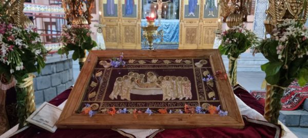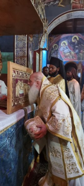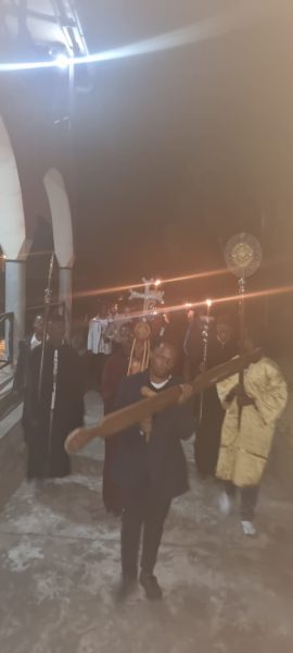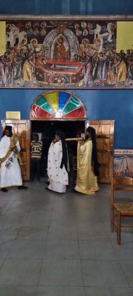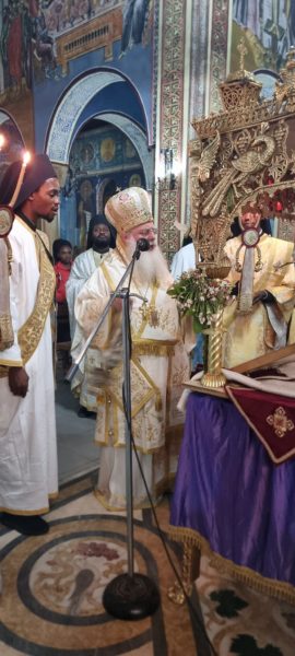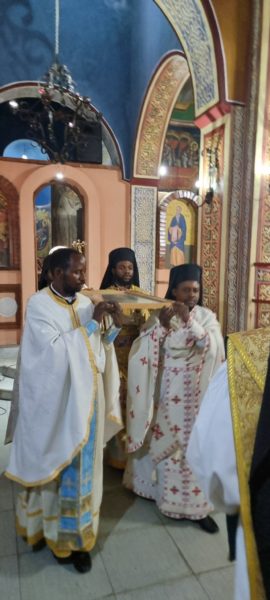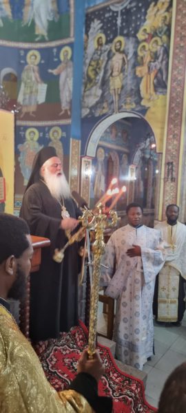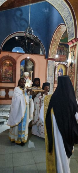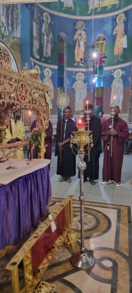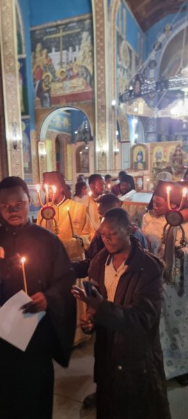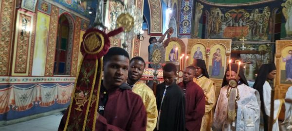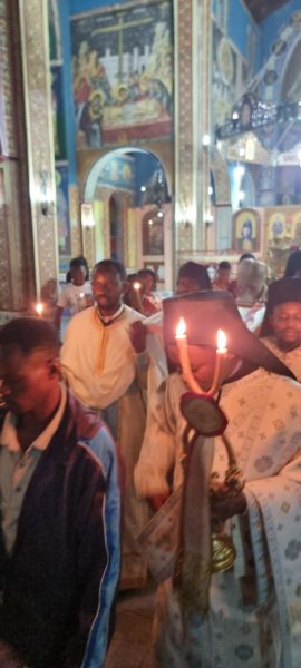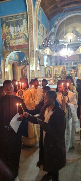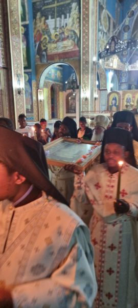 Στην Ιερά Μονή Οσίου Αθανασίου του Αθωνίτου στην Κινσάσα, πρωτεύουσα της Λαϊκής Δημοκρατίας του Κονγκό, ο Σεβασμιώτατος Μητροπολίτης Κινσάσας κ. Θεοδόσιος μαζί με τους μοναχούς και τους εναπομείναντες φοιτητές της τοπικής Θεολογικής Σχολής έψαλλαν το απόγευμα της Πέμπτης 8 Αυγούστου 2024 τα Εγκώμια της Θεοτόκου μπροστά από τον επιτάφιο της.