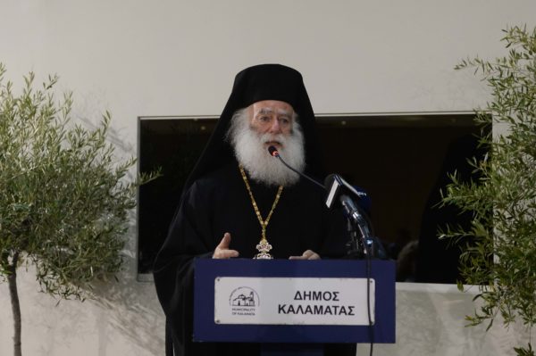 «Θέλω να σας ευχαριστήσω για την αγάπη σας. Θέλω να έχετε αγάπη και ομόνοια. Ο Θεός σας χάρισε ένα τόσο όμορφο κομμάτι της γης. Ο Θεός ορίζει τα σύνορά μας. Ορίζει τη γλώσσα μας, τις καρδιές μας, ορίζει τις φιλίες μας, τις οποίες ποτέ δεν πρέπει να προδίδουμε. Θέλω να σας ευχηθώ, ο ωραίος αυτός τόπος, να τον βλέπετε και να υλοχαρεί, όπως λέμε στην εκκλησιαστική γλώσσα, και θέλω να σας ζητήσω κάτι δήμαρχέ μου, και ξέρω ότι δεν θα μου το χαλάσετε το χατίρι, όποτε μπορείτε…», είπε, απευθυνόμενος στον Δήμαρχο Καλαμάτας, και προσκαλώντας τον μαζί με τον πρώην Πρωθυπουργό Αντώνη Σαμαρά, να επισκεφτούν την Αλεξάνδρεια.