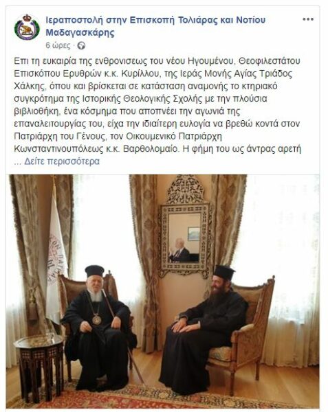 Λίγα λόγια, εξόχως εξομολογητικά, ιδιαιτέρου συναισθήματος και συγκινήσεως, παραθέτει ο Επίσκοπος Τολιάρας και Νοτίου Μαδαγασκάρης, κ. Πρόδρομος, περιγράφοντας την επίκαιρη κατ’ ιδίαν συνάντηση του με τον Παναγιώτατο Οικουμενικό Πατριάρχη, κ.κ. Βαρθολομαίο: