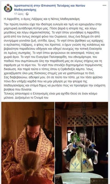 Στη σελίδα “Ιεραποστολή στην Επισκοπή Τολιάρας και Νοτίου Μαδαγασκάρης” του κοινωνικού δικτύου Facebook, δημοσιεύεται επίκαιρο κείμενο του Επισκόπου Τολιάρας και Μαδαγασκάρης, κ. Προδρόμου, υπό τον τίτλο “Η Αφροδίτη, ο άγιος Λάζαρος και η Νότιος Μαδαγασκάρη”, το οποίο έχει ως εξής: