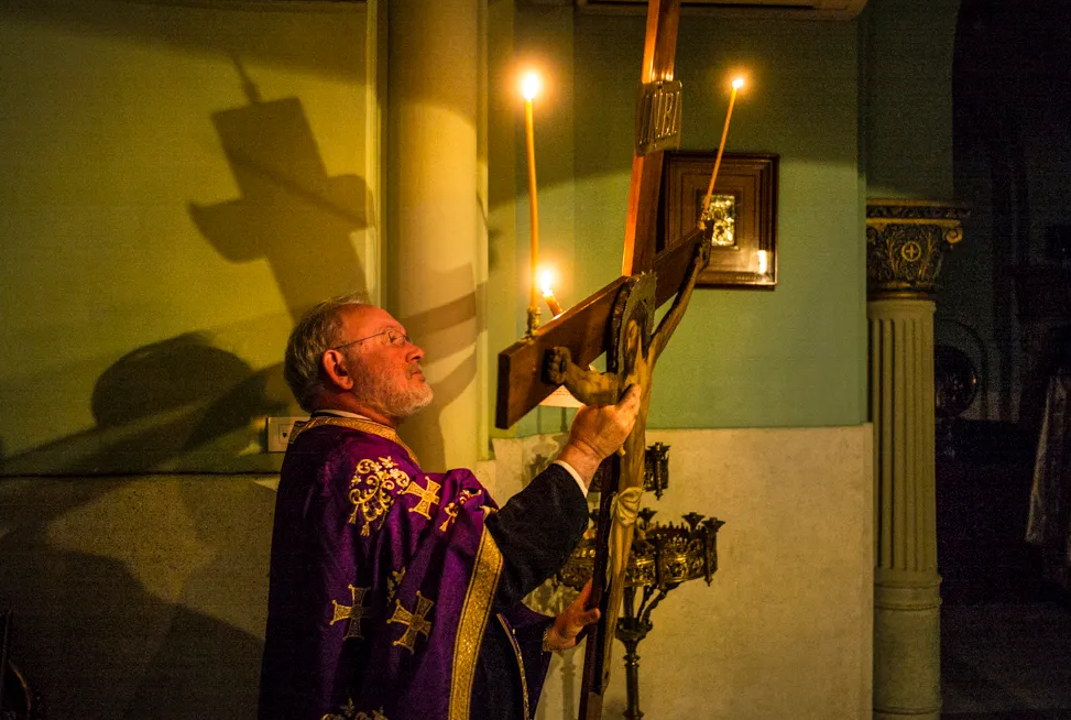 Τα φώτα σβήνουν, και σαν βαρύ πέπλο, το πυκνό σκοτάδι απλώνεται απ’ άκρη σ΄άκρη σε αυτή την καθηλωτική στιγμή της Ακολουθίας των Παθών. Το Ιερό του Ναού μονώνεται ενεργειακά και τα τρία κεριά του Σταυρού ανάβουν για να φωτίσουν τον επικείμενο Γολγοθά.