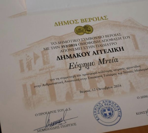 Ευγνωμοσύνη εκφράζει η Ιερά Επισκοπή Τολιάρας και Νοτίου Μαδαγασκάρης προς τον Δήμο Βέροιας και τον Σεβασμιώτατο Μητροπολίτη Βεροίας, Ναούσης και Καμπανίας κ. Παντελεήμονα για την τιμητική διάκριση με το βραβείο ΕΥΦΗΜΟΥ ΜΝΕΙΑΣ που απονεμήθηκε στις δύο εθελόντριες παιδιάτρους από τη Βέροια, την Αγγελική Δημάκου και την Σταυρούλα Παπαχατζή.