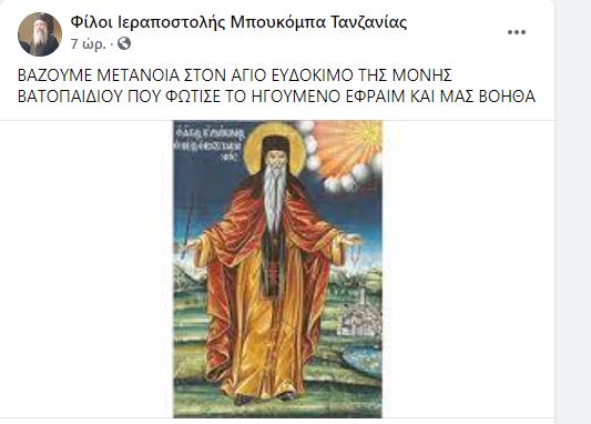 Στην ανάρτηση τονίζεται ότι η Ιερά Μεγίστη Μονή Βατοπαιδίου αποφάσισε να αποδεχθεί σχετικό αίτημα της Επισκοπής Μπουκόμπα του Πατριαρχείου Αλεξανδρείας, και αναλαμβάνει να στέλνει κάθε μήνα τους μισθούς των Ιερέων.