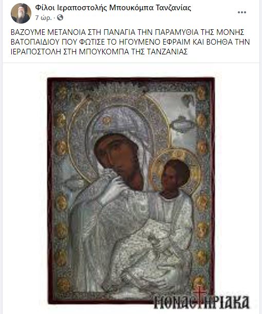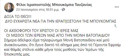 Στην ανάρτηση τονίζεται ότι η Ιερά Μεγίστη Μονή Βατοπαιδίου αποφάσισε να αποδεχθεί σχετικό αίτημα της Επισκοπής Μπουκόμπα του Πατριαρχείου Αλεξανδρείας, και αναλαμβάνει να στέλνει κάθε μήνα τους μισθούς των Ιερέων.