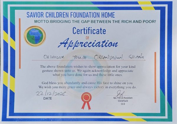 Σύμφωνα με ανάρτηση της Ιεράς Μητρόπολης Άκκρας σε μέσο κοινωνικής δικτύωσης, μέσω της Ορθόδοξης Νεολαίας, προσέφερε υλική βοήθεια στο ορφανοτροφείο “Savior Children Foundation” στην περιοχή Amanfro–Kingstown, στην ευρύτερη περιφέρεια της Greater Accra. Η πρωτοβουλία αυτή αποτελεί έμπρακτη έκφραση της διαρκούς ποιμαντικής και κοινωνικής μέριμνας της Εκκλησίας για τα παιδιά που στερούνται οικογενειακής φροντίδας, μεταφέροντας μήνυμα ελπίδας, αξιοπρέπειας και πνευματικής ενίσχυσης.