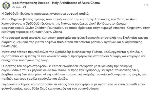 Σε πνεύμα αγάπης και προσφοράς, εμπνευσμένο από το χαρμόσυνο μήνυμα της Ενανθρώπησης του Θεού, η Ορθόδοξη Εκκλησία της Γκάνας πραγματοποίησε φιλανθρωπική δράση με επίκεντρο τα ορφανά παιδιά.
