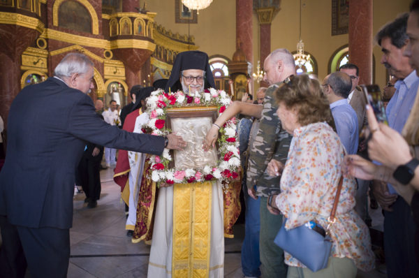 Η λιτάνευση της Ιεράς Εικόνας του Αγίου Γεωργίου αποτέλεσε κορυφαία και συγκινητική στιγμή, με τους πιστούς να προσπαθούν να αγγίξουν την εικόνα για να λάβουν την ευλογία του Μεγαλομάρτυρα. Ο Άγιος Γεώργιος, πρώτος των Μεγαλομαρτύρων, με το μαρτύριό του υπερίσχυσε του θανάτου και απέκτησε στο διηνεκές το χρυσό στεφάνι της δόξας.