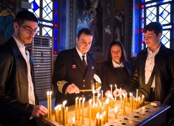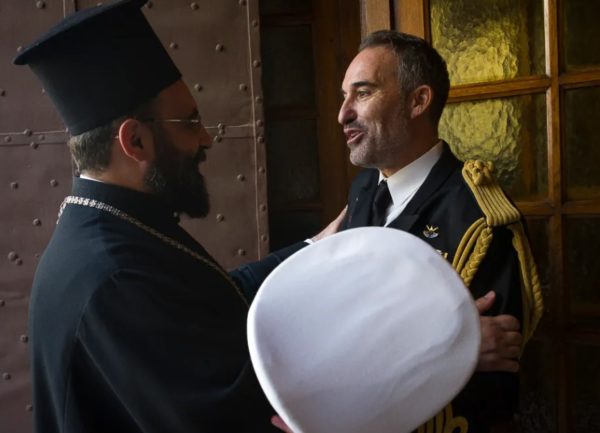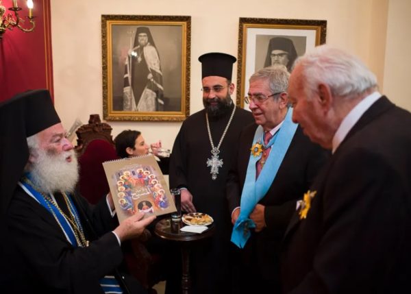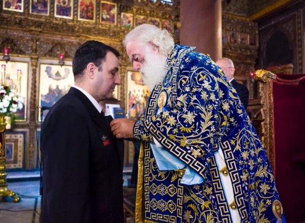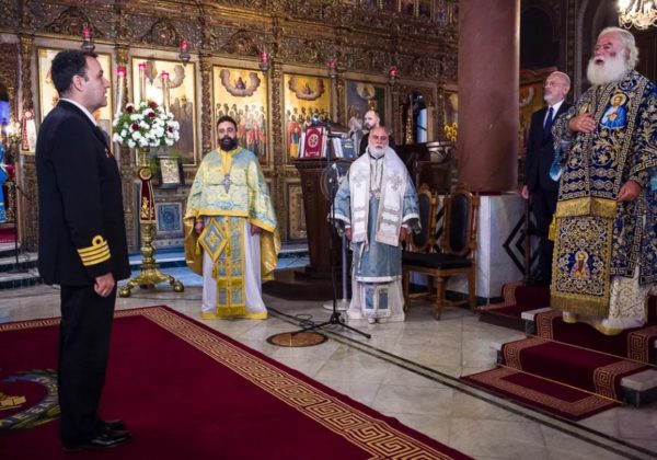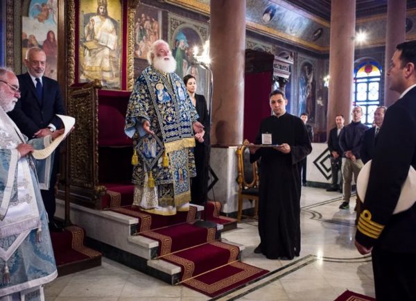 Μια ευχάριστη έκπληξη επεφύλαξε για την συνέχεια ο Μακαριώτατος, ο οποίος τίμησε τον απερχόμενο Ακόλουθο Άμυνας της Πατρίδας μας Πλοίαρχο Μιχάλη Τσιλιγκάκη με τον Χρυσό Σταυρό του Σάββα του Ηγιασμένου, εις αναγνώριση της προσφοράς και της έμπρακτης στήριξής του στην Εκκλησία του Χριστού. «Μιχάλη μου, σήμερα που εορτάζει ο Άγιος Νικόλος, που εορτάζει το ένδοξο Πολεμικό μας Ναυτικό, θα ήθελα να σε χαιρετήσω. Σε αγαπώ πολύ, γιατί είσαι και από το νησί μου την Κρήτη, μα πάνω από όλα γιατί έχεις μια όμορφη οικογένεια. Έχεις φόβο Θεού και αγάπη προς τον Χριστό. Αναχωρείς και καλωσορίζω τον αντικαταστάτη σου με πολλή αγάπη. Σου εύχομαι ευλαβέστατέ μου κυβερνήτα Μιχαήλ, να έχεις την ευλογία του Θεού. Ό Άγιος Νικόλαος να σε σκεπάζει και σε ευχαριστούμε για την αγάπη και την ωραία συνεργασία όλα αυτά τα χρόνια», είπε ο Πατριάρχης κ.κ. Θεόδωρος και περικόσμησε τον τιμώμενο Πλοίαρχο με τον Χρυσό Σταυρό ενώ αναφώνησε με χαρά και περηφάνια ΆΞΙΟΣ, ξεκινώντας τον Εθνικό μας Ύμνο με όλους να ακολουθούν την φωνή του.