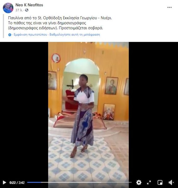 Η Παυλίνα από την Ορθόδοξη Ενορία του Αγίου Γεωργίου στο Νυέρι της Κένυας επιθυμεί να γίνει δημοσιογράφος. Αυτό είναι το όνειρο και ο μεγάλος πόθος της. Το παρακάτω βίντεο δημοσιεύει ο Θεοφιλέστατος Επίσκοπος Νιέρι και Όρους Κένυας κύριος Νεόφυτος σε επίκαιρη ανάρτησή του. Η γλώσσα του Κυρίου Ιησού Χριστού είναι η γλώσσα της καρδιάς, είναι μία και δε χρειάζεται μετάφραση.