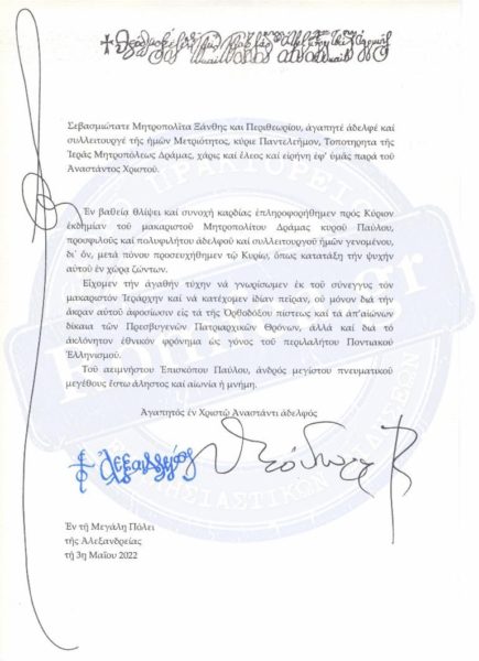 Στην συλλυπητήρια επιστολή του για την εκδημία του μακαριστού Μητροπολίτη Δράμας κυρού Παύλου προς τον τοποτηρητή της χηρευούσης Μητροπόλεως Σεβ. Ξάνθης κ. Παντελεήμονα, ο Μακαριώτατος Πατριάρχης Αλεξανδρείας κ.κ. Θεόδωρος Β’ αναφέρθηκε στην αφοσίωση του μακαριστού στα της Ορθοδόξου Πίστεως, στα δίκαια των Πρεσβυγενών Πατριαρχικών Θρόνων και στο ακλόνητο εθνικό φρόνημα του, ως γόνου του Ποντιακού Ελληνισμού.