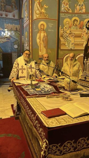 Σήμερον ἡ Χάρις τοῦ Ἁγίου καί Τελεταρχικοῦ Πνεύματος ἡμᾶς συνήγαγεν εἰς λατρευτικήν Σύναξιν, προκειμένου νά τελέσωμεν τό Μυστήριον τῆς Θείας Εὐχαριστίας καί νά μετάσχωμεν τοῦ ζωοποιοῦ Σώματος καί του ζωηρρύτου Αἵματος τοῦ Κυρίου καί Σωτῆρος μας Ἰησοῦ Χριστοῦ, εἰς ἄφεσιν ἁμαρτιῶν καί εἰς ζωήν αἰώνιον καί εἰς σύνδεσμον καί κοινωνίαν μεταξύ ἡμῶν καί τοῦ Ἀρχηγοῦ τῆς Ἐκκλησίας ἡμῶν, ἐνανθρωπήσαντος Υἱοῦ καί Λόγου τοῦ Θεοῦ.